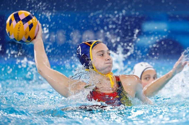 8月4日,西班牙隊球員埃萊娜(左)在比賽中。當日,在巴黎奧運會女子水球小組賽B組比賽中,西班牙隊13比11戰勝意大利隊。新華社記者 張玉薇 攝
