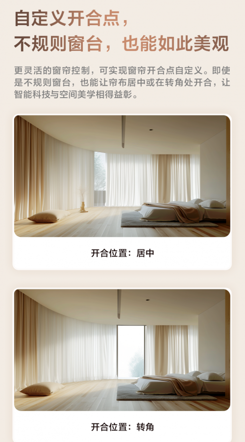 雙電機及左右獨立控制的特性,讓 Aqara 風琴智能窗簾電機 C4 在應對不規則窗臺時也能游刃有余,如帶拐角的窗臺實現在拐角處開合等傳統窗簾電機無法實現的功能。