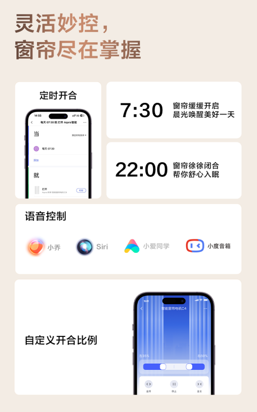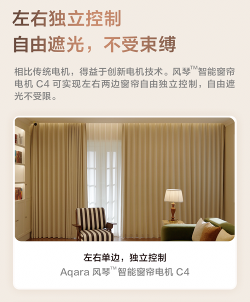 多項創新加持,讓智能窗簾體驗更人性化、個性化、同時也帶來更多玩法,不僅可以為左右窗簾單獨設置更多的自動化場景,還可以自定義多種情景模式,如早晨 30 分鐘以極緩速度慢慢打開窗簾的起床喚醒場景,更可與燈光、溫控、音響設備形成聯動,帶來全方位的全屋智能體驗。
