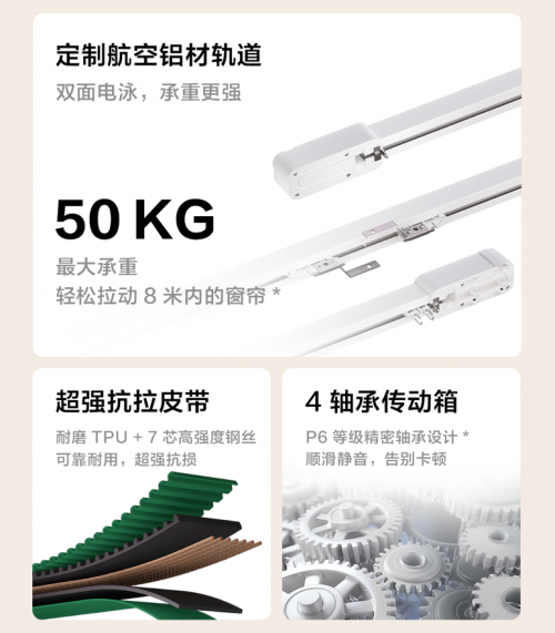 不僅如此,該軌道還具備堅固耐用的品質,最大可承重 50kg,輕松拉動 8 米內的窗簾,內部鋼絲與凱夫拉材質結合的皮帶加上 4 軸承傳動箱的設計,既抗損耐用又順滑隔音。