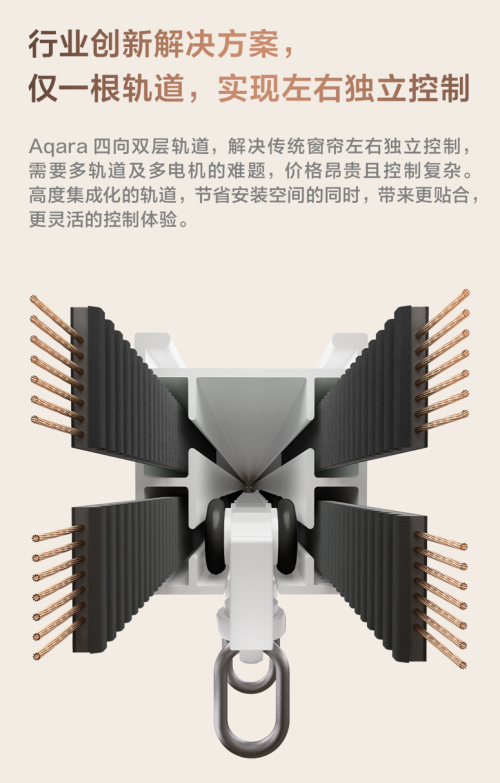 與 Aqara 風琴 智能窗簾電機 C4 搭配的為 Aqara 全新定制的四向雙層軌道,僅用一根軌道即實現窗簾左右獨立控制,完美解決以往需要兩個軌道帶來的價格高、控制復雜、貼合度差、占用空間大的問題,不僅帶來更貼合、更靈活的控制體驗,也能適應更多的個性化場景。
