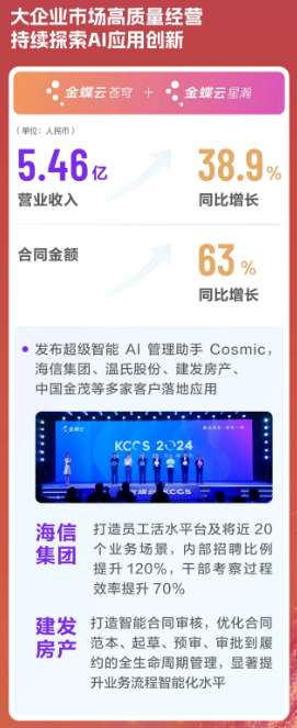 而2024年上半年,金蝶在央企、國企及500強企業領域持續拓客,成功簽約和中標多家行業領軍企業,比如中國石油天然氣集團、中國航空集團、東風汽車、通威股份、北控水務、龍湖集團、招商蛇口、海化集團及嶺南集團等。金蝶管理層表示,金蝶已經服務于超過一半的《財富》中國500強。另據業內人士透露,金蝶在民營企業已經出現上億元的合同訂單。