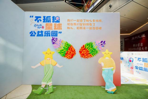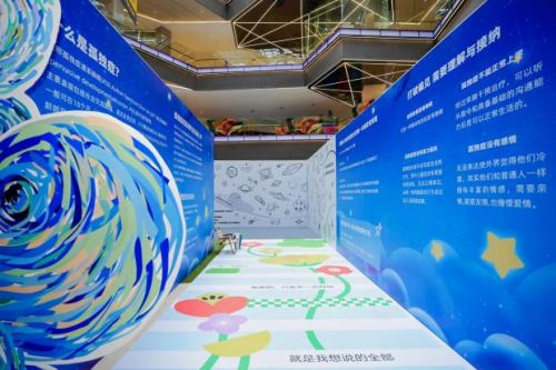 9月7日—8日,蕭山眾安廣場一樓中庭里人頭攢動,聚集在一座藍色主題的樂園周邊,樂園入口處播放著清脆的童聲,講述著孤獨癥兒童的內心獨白;漫游其中,地面精心設計了地貼指引,以孤獨癥兒童的口吻,引導著參與者向前探索他們的內心世界;在迂回的樂園通道里每隔幾步就是一處神秘打卡點,“秘密星球、璀璨星河、星星世界......”多個主題互動讓愛心人士在參與中逐漸加深對孤獨癥兒童的理解。