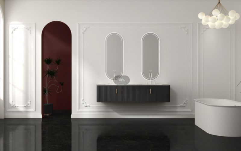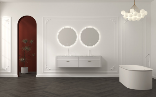 如果你追求溫馨舒適的生活格調(diào),伊芙琳浴室柜是個(gè)不錯(cuò)的選擇。其采用輕法式風(fēng)格設(shè)計(jì),溫潤(rùn)百搭的色調(diào),能輕松融入各種家居環(huán)境。雙智能圓鏡設(shè)計(jì),正面配備美妝照明,還有高效除霧功能,讓每一次自我審視都清晰明了。而鏡背的氛圍燈光,則為浴室空間增添了一抹浪漫與溫馨。