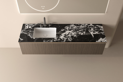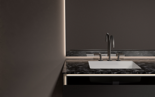 盧森諾浴室柜,將隱奢風(fēng)格運(yùn)用到極致,其靈魂之所在——范思哲黑奢石臺(tái)面,猶如夜幕下深邃的宇宙,繡金般的細(xì)膩紋理在黑色肌底中隱隱閃爍,仿佛絢爛星河于光影交錯(cuò)間悄然流淌,不張揚(yáng)卻足以讓人一眼難忘,盡顯不凡品味。
