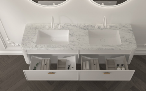 立體造型的功能雙抽,提供了大容量的收納空間,讓洗浴用品的擺放井然有序。大圓弧油漆主柜,觸感絲滑溫潤(rùn),搭配上高級(jí)精致的大理石臺(tái)面,提升了整體的檔次感。同時(shí),其臺(tái)邊可做造型、無縫拼接臺(tái)下盆工藝,既美觀又實(shí)用。