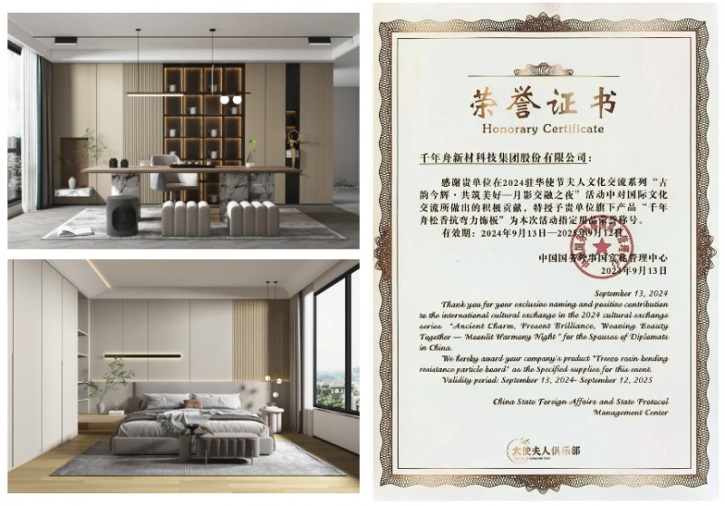 以強勁的硬實力,開創高端生活新境界。實力品質,國際認可。千年舟松香抗彎力飾板榮獲2024駐華使節夫人文化交流系列“古韻今輝·共筑美好——月影交融之夜”活動指定用品榮譽稱號,一張好板,對國際文化交流事業做出積極貢獻。以此為基材的樂凈抗彎力飾生態板、樂凈抗彎家具力飾生態板,把功能與美學無界融合,凝合現代高雅品質。