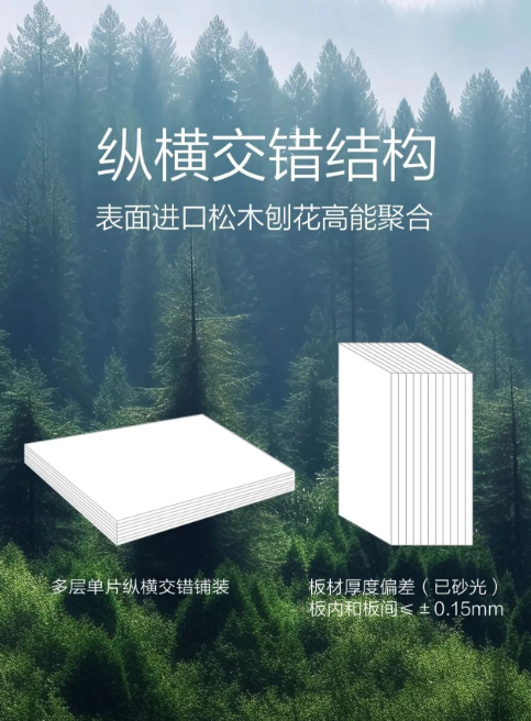 板芯采用多層全桉木縱橫交錯結構,內應力變化小,表面進口松木刨花高能聚合,翹曲度≤12mm,板面平整,有效解決表面碳化、鼓包、波浪紋等問題,整體性能更加穩定。