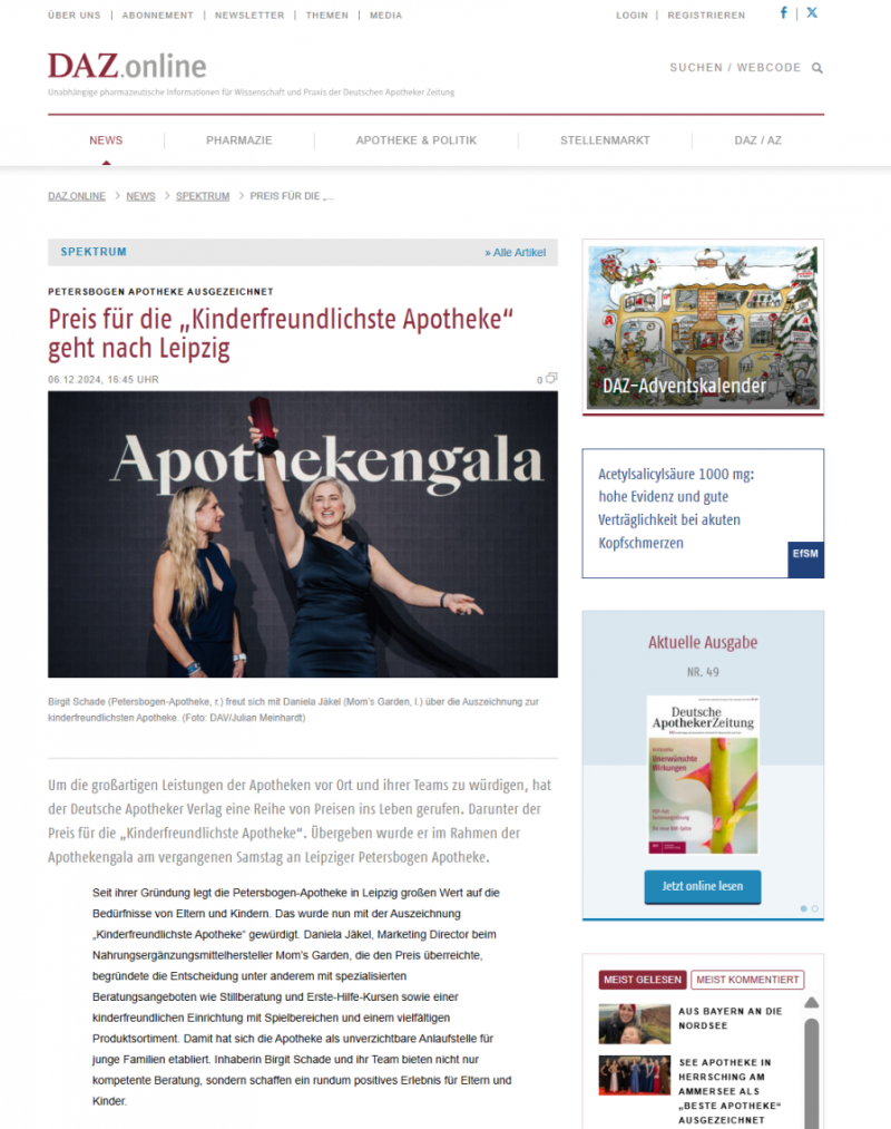 德國藥房行業(yè)權威報社DAZ報道inne為“全德最友好兒童藥房獎”頒獎