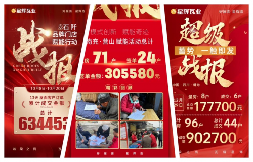 活動期間,在總部的政策支持下,經銷商門店推出超多驚喜鉅惠,人氣火爆。并且,在總部動銷團隊和門店銷售團隊的共同努力下,12月25日-12月29日,短短5天時間就已實現簽單44戶,累計收款902700元的驕人業績,不僅遠超預計目標,更是直逼百萬大關!這一成果不僅是星輝瓦業總部服務經銷商的具象表現,更是終端門店與總部同頻共振、聚力前行的成果凸顯!