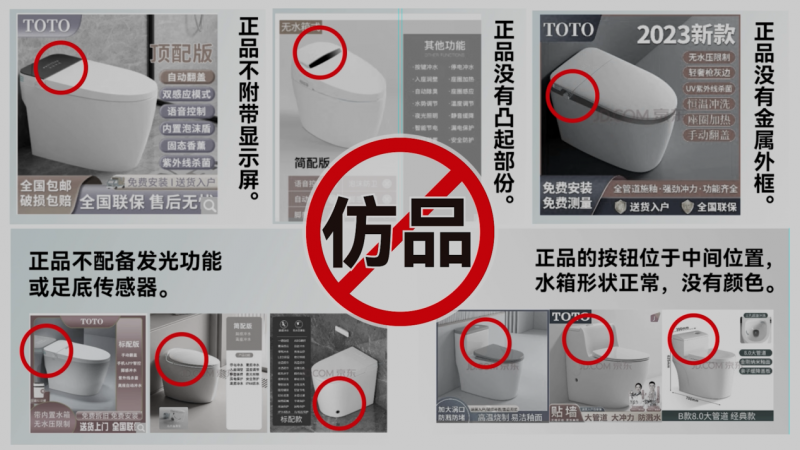 作為衛(wèi)浴界的“老網(wǎng)紅”,TOTO以其百年歷史和優(yōu)良品質,獲得了諸多消費者的青睞,同時也引致TOTO仿冒品層出不窮。這不僅損害了TOTO的品牌形象和產品美譽度,更以劣質材料和品質威脅著消費者的健康和安全,曾經(jīng)也出現(xiàn)過TOTO仿冒品導致購買者的人身安全和財產受損的案例。