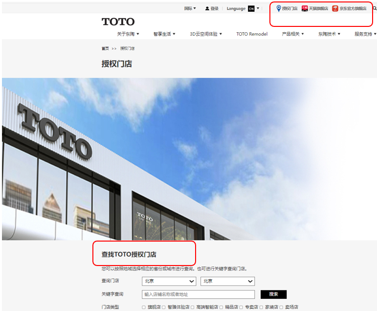 在TOTO的官方網(wǎng)站www.toto.com.cn的右上角可以查詢TOTO授權門店或者獲取官方網(wǎng)絡店鋪信息。