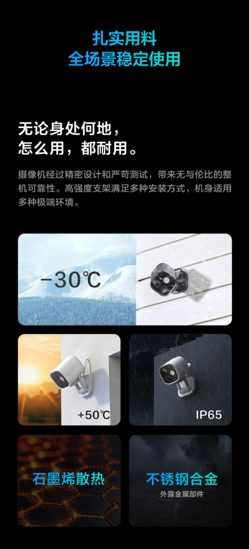 Aqara智能攝像機(jī) G5 Pro通過(guò)IP65防水防塵認(rèn)證,支持-30°C至50°C超寬溫域運(yùn)行,內(nèi)置石墨烯散熱模塊與防雷擊設(shè)計(jì),輕松應(yīng)對(duì)雨雪、沙塵及極端天氣。