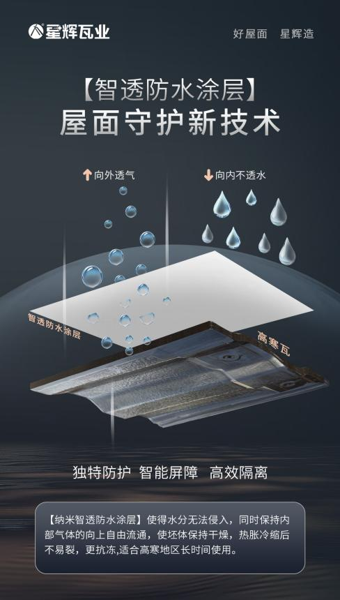 智透防水涂層工藝,兼具防水、透汽兩大性能,不僅能夠有效隔絕99%的水汽進入瓦體,還能夠在一定條件下為水汽排出提供一條通道,保證瓦體長期干燥,提升產品耐久性,延長產品壽命。