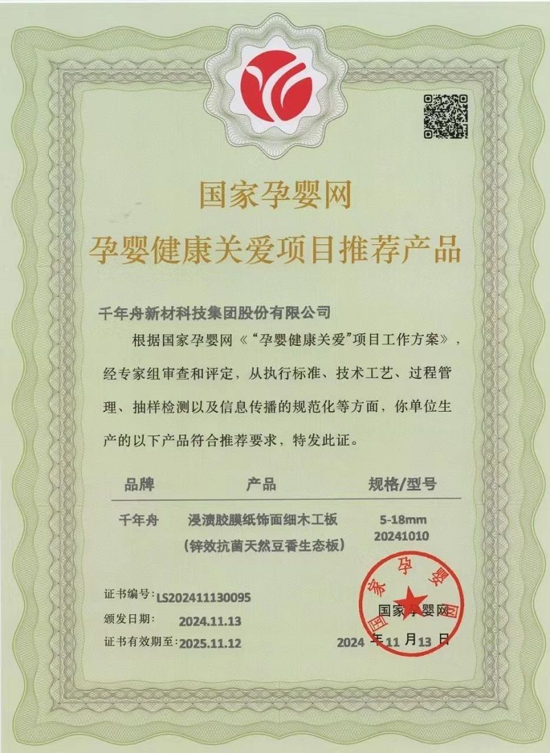 同時,千年舟還積極響應國家綠色環保政策,致力于打造綠色環保的家居產品,多個產品獲得浙江省“品”字標認證,刨花板、osb板產品通過了“兒童安全級產品認證”,鋅效抗菌天然豆香生態板更是通過了孕嬰級品質認證,為消費者的健康生活保駕護航。