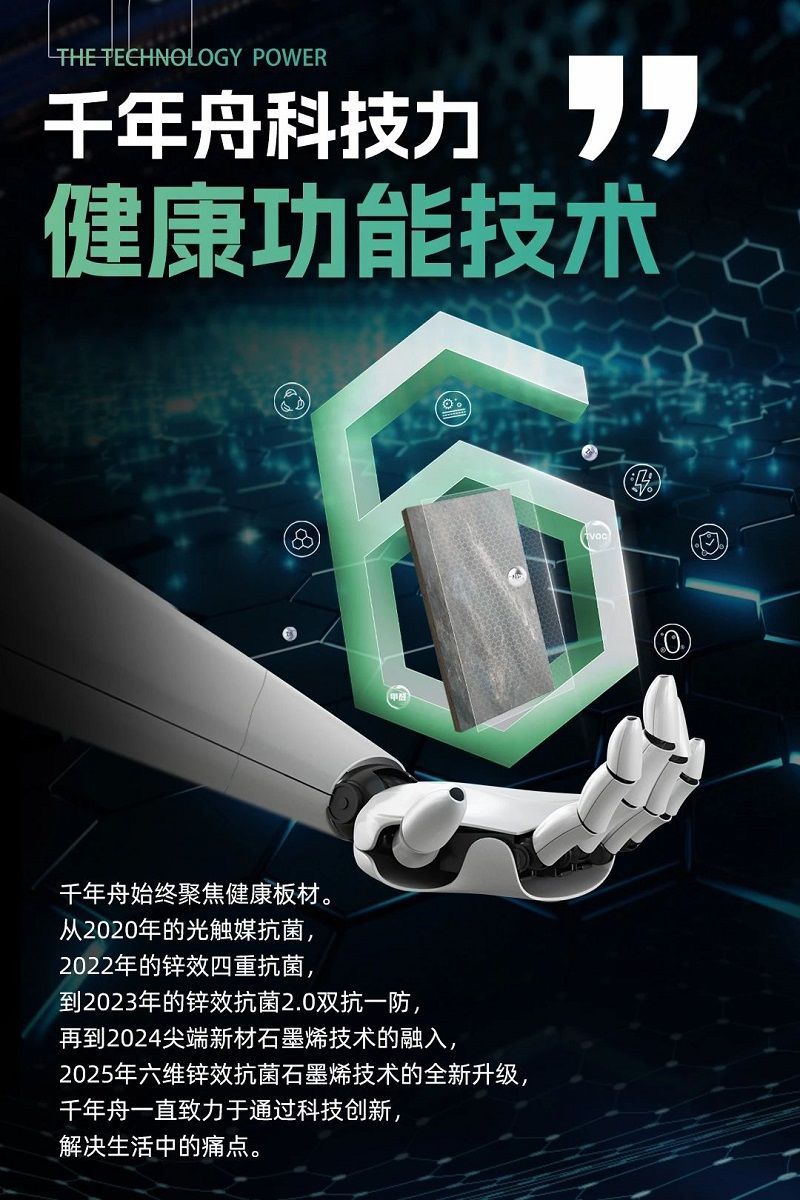 從2020年的光觸媒抗菌,2022年的鋅效四重抗菌,到2023年的鋅效抗菌2.0雙抗一防,再到2024尖端新材石墨烯技術(shù)的融入,2025年六維鋅效抗菌石墨烯技術(shù)的全新升級(jí),千年舟一直致力于通過(guò)科技創(chuàng)新,解決生活中的痛點(diǎn)。