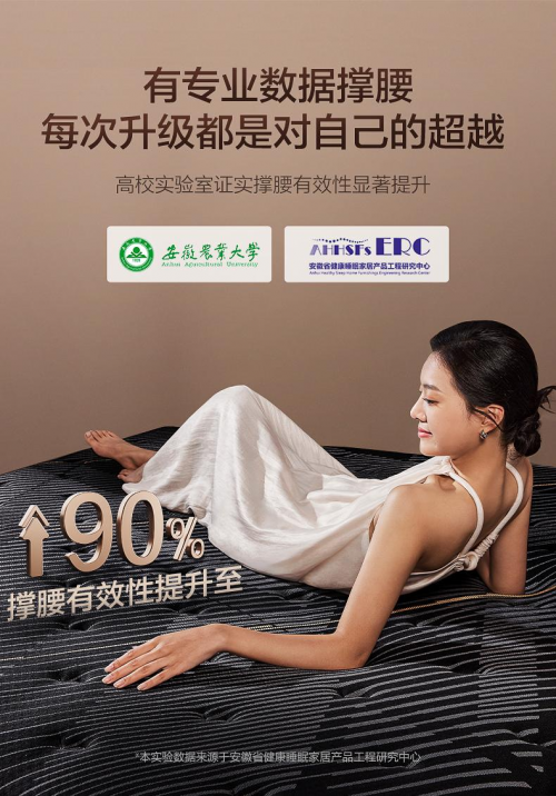 進(jìn)入 2025 年,顧家家居并未滿(mǎn)足于已有成績(jī),而是對(duì)撐腰床墊進(jìn)行了全面升級(jí),做到更撐腰,更沁爽。經(jīng)安徽農(nóng)業(yè)大學(xué)實(shí)證,其撐腰有效性達(dá)到 90%+,獲得專(zhuān)業(yè)認(rèn)證。升級(jí)后的床墊舒適度和耐用性進(jìn)一步提升,在延續(xù)經(jīng)典支撐性能的同時(shí),更加貼合人體工學(xué)設(shè)計(jì),為用戶(hù)帶來(lái)更極致的睡眠體驗(yàn)。
