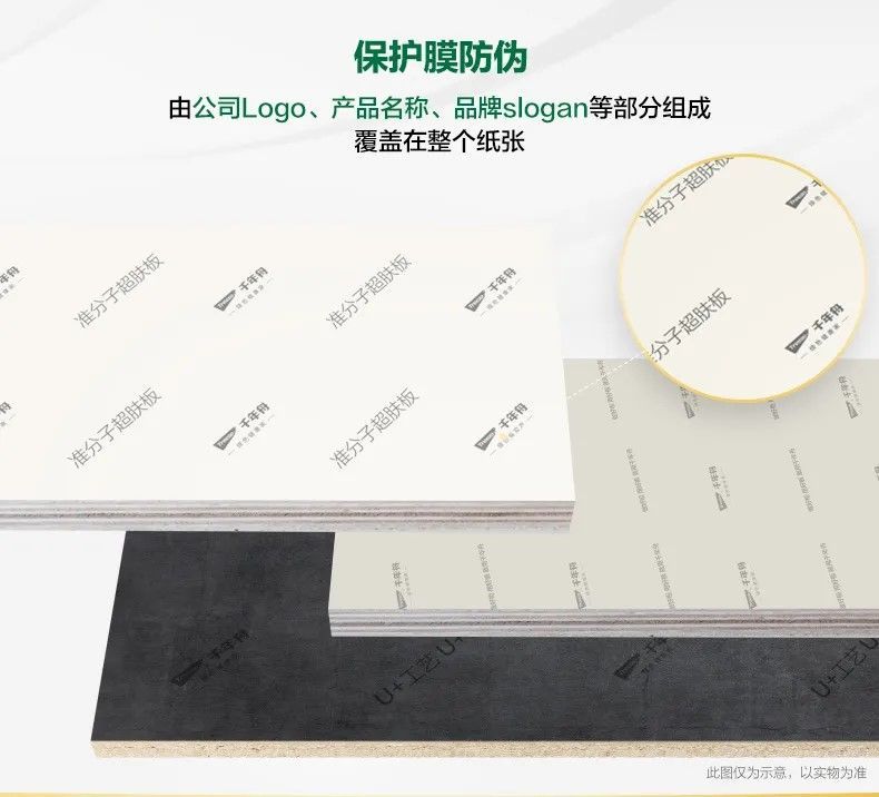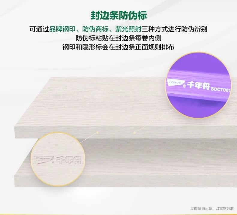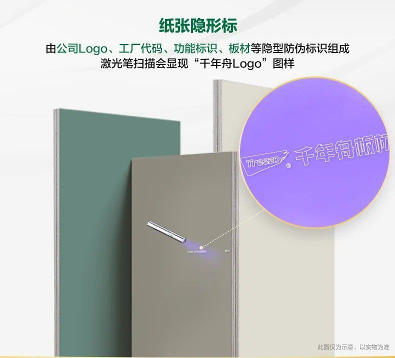 由公司Logo、工廠代碼、功能標識、板材等隱型防偽標識組成,激光筆掃描會顯現(xiàn)“千年舟Logo”圖樣。