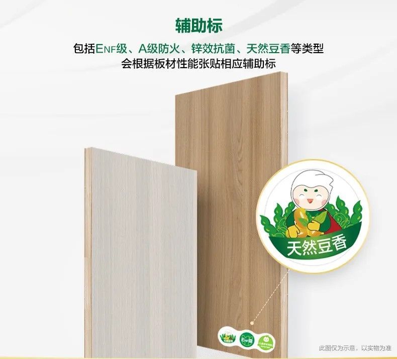 包括ENF級、A級防火、鋅效抗菌、天然豆香等類型,會根據(jù)板材性能張貼相應(yīng)輔助標。