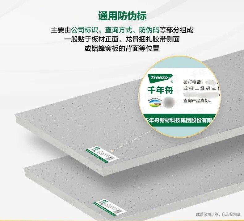 主要由公司標識、查詢方式、防偽碼等部分組成,一般貼于板材正面、龍骨捆扎膠帶側(cè)面或鋁蜂窩板的背面等位置。