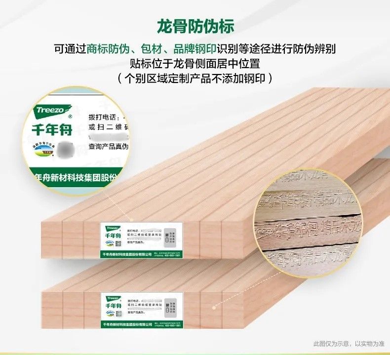 可通過商標防偽、包材、品牌鋼印識別等途徑進行防偽辨別,貼標位于龍骨側(cè)面居中位置(個別區(qū)域定制產(chǎn)品不添加鋼印)。