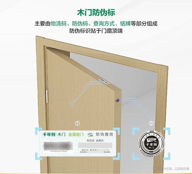 主要由物流碼、防偽碼、查詢方式、銘牌等部分組成,防偽標識貼于門扇頂端。
