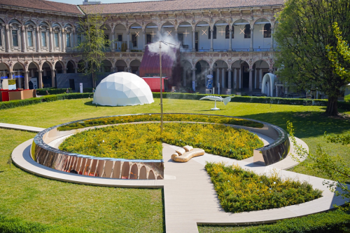 光合機構陳耀光創作的裝置作品《禮物》,以意大利的金雀花、中國的迎春花和連翹花等春天花卉為素材編織的圓形花田煥發出勃勃生機,讓暢游其間的參觀者感受自然的饋贈。而不銹鋼鏡面折射的參觀者、米蘭大學建筑群以及自然景觀將人代入一場陳耀光所說的“預謀的劇場”,在“家-天-地”的東方哲思中感受再創造的魅力。作品中可伸縮的陽光雨露機械裝置成為點亮《禮物》蛋糕的“蠟燭”,所帶來的交互體驗也讓人耳目一新。此外,陳耀光的這件作品還將可持續發展理念貫穿始終:裝置采用節能燈及太陽能板、再生環保地面鋪裝等制作而成,不僅所有的材料可回收再用,花卉也可以與當地周邊社區居民分享,延續生命的循環,人類對自然的友善和敬畏通過此次裝置展展現地淋漓盡致。