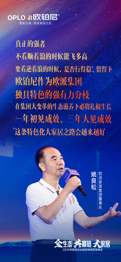 會上,歐派集團董事長姚良松先生明確指出,真正的強者,不看順著浪的時候能飛多高,要看逆著浪的時候,是否行得穩、留得下。歐鉑尼作為歐派體系內一支茁壯成長的分支,必將在集團的滋養下扎根生長,一年初見成效,三年大見成效,這條特色化大家居之路會越來越好。