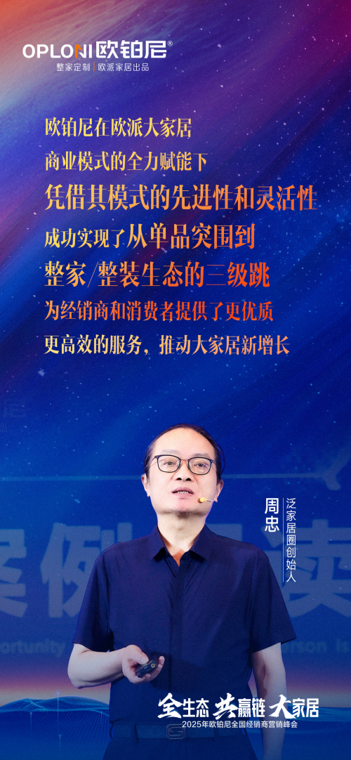 峰會現場,泛家居圈創始人周忠認為,歐鉑尼的“三級跳”發展路徑向行業提供了高效轉型實踐樣本,為經銷商和消費者提供了更加優質、高效的服務,推動大家居產業的新增長。此外,周忠還從多維度點評了歐鉑尼模式的科學性。依托歐派強大的供應鏈集采優勢,歐鉑尼實現櫥衣門墻衛電配+主輔材一站配齊,以“整家定制、舊改、整裝、拎包/新媒體、中介/裝修”進行全域覆蓋,歐鉑尼的運營邏輯既輕且穩,整家戰略開路,多業態并行,這不是簡單的品類競爭,而是通過生態協同帶來的效率革命!