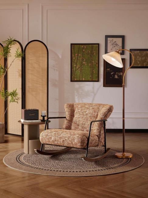 而沙發(fā)一旁的搖搖椅,金屬框架和實(shí)木底座結(jié)合,三防提花面料流淌自然曲線形態(tài),猶如陽(yáng)光灑在成熟的柑橘果實(shí)上,生活此刻搖曳生姿。
