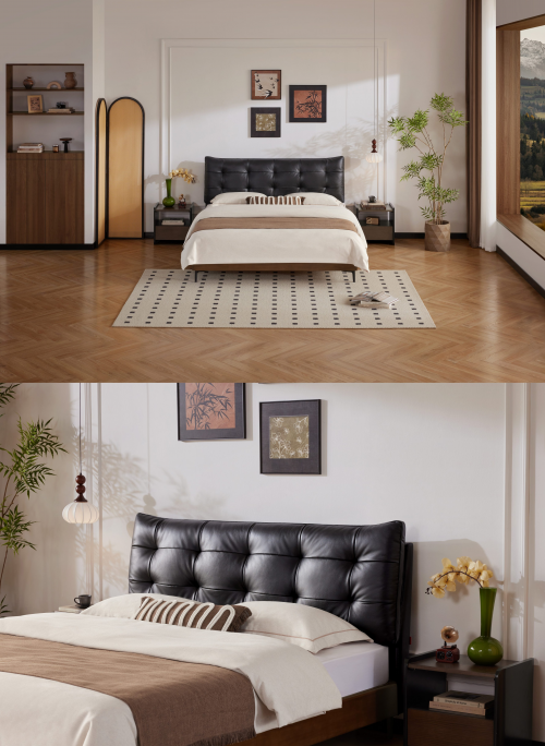 可可皮床(LH.B1022PQ1)融合牛皮床頭和實(shí)木框架,材質(zhì)的混搭正是古典與現(xiàn)代的交融,雙層靠包、拉點(diǎn)設(shè)計(jì)無不營(yíng)造舒適靠感和臥室美感,讓中古風(fēng)洋溢在臥室生活的每處角落。