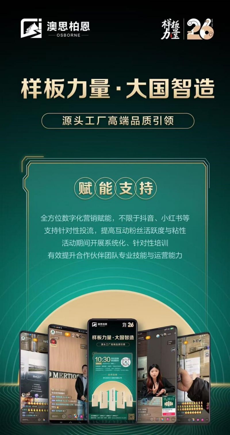 面對板材行業(yè)轉(zhuǎn)型升級的核心命題,澳思柏恩正式推出“樣板力量·大國智造”品牌日活動,以持續(xù)性、系統(tǒng)化賦能為核心,構(gòu)建貫穿伙伴成長體系,助力合作伙伴實現(xiàn)從產(chǎn)品認知到市場占位的長效價值提升。