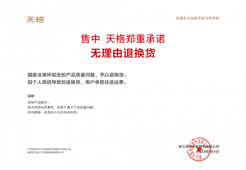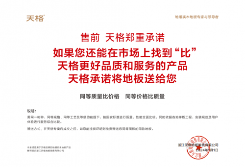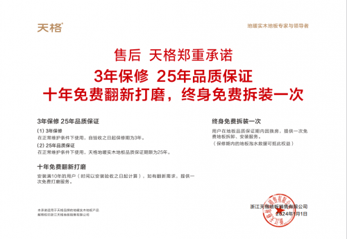 為進一步保障用戶地板使用權益,天格地板還推出了五大承諾保障。其中包含售前質量與價格的對比,售中無理由退換貨,售后的3年保修、25年品質保證、十年免費翻新打磨、終身免費拆裝一次。值得一提的是,3年保修這一條,不僅彰顯了天格對產品質量的自信,更以其超越行業標準的保修期,樹立了地板行業售后服務的最高典范。