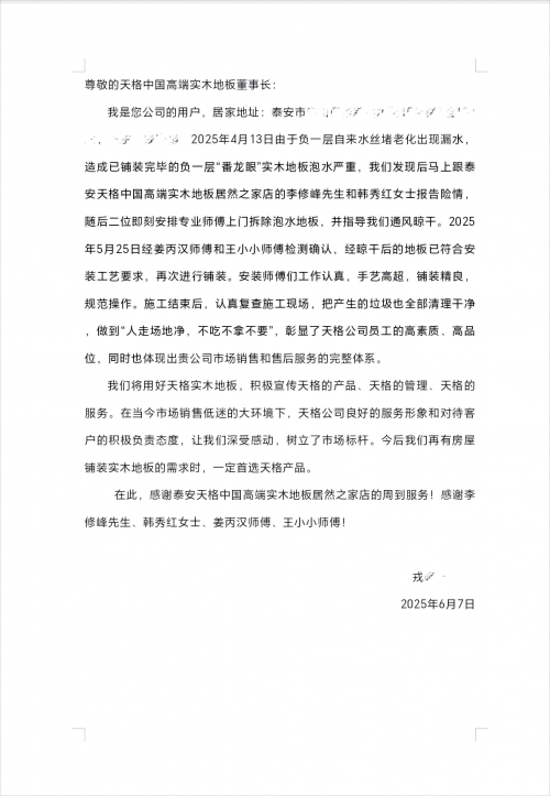 天格高端實木地板因為采用虎口榫實木鎖扣連接,安裝不需要打釘打龍骨,在遭遇泡水等意外時,可以將地板及時拆卸并重裝,為用戶節省大量損失。近日,來自泰安的戎女士向天格總部發來了感謝信:4月13日由于自來水管漏水,她家負一層地板泡水嚴重,緊急與當地門店聯系之后,天格第一時間派出專業安裝工程師對地板進行救援拆除,并現場通風晾干;5月25日經過檢測確認,晾干后的地板被再次鋪裝在戎女士家中。專業及時的售后救援、匠心細致的服務態度,獲得了戎女士全家的高度好評,她表示后面再裝修一定還選天格地板。