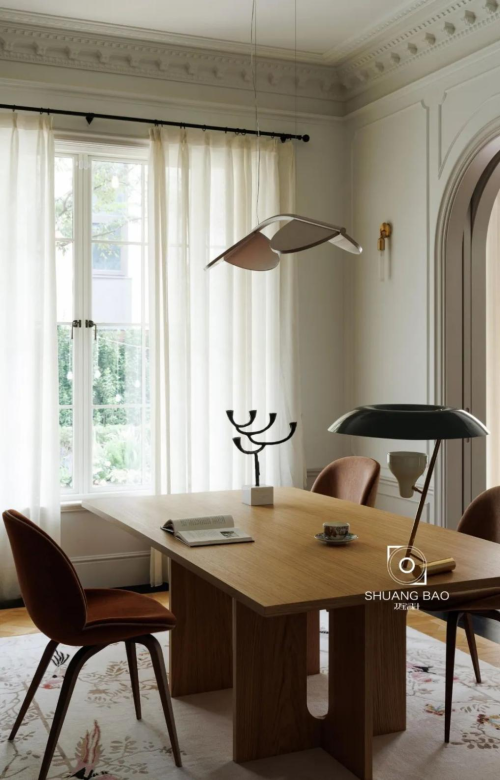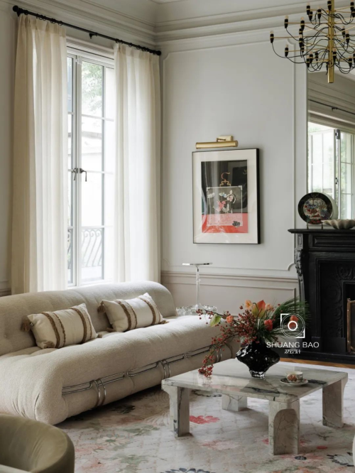 吊燈來自Flos,沙發來自Cassina,羊毛椅來自&tradition,玻璃小邊幾來自意大利glas,茶幾來自Gubi。壁爐兩側的掛畫來自藝術家文藝的國畫《春風無限》和《牽絲戲》。軟裝的陳列不會過度刻意,在一派祥和之中,足以窺見所傳遞出的悠閑生活方式。落地窗讓光線暢通無阻地在室內流動,將花園的美景引入室內,若隱若現的薄紗又能保護室內私密,拉上窗簾,家即可成為一個超脫城市喧囂的內向宇宙。