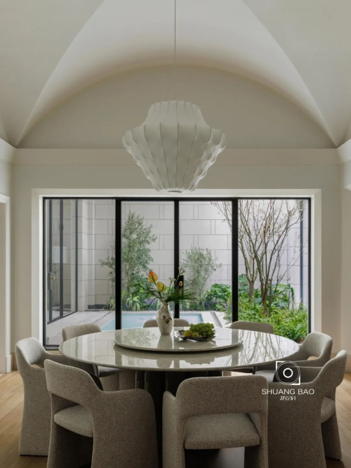 餐廳上方的穹頂設計,流暢的弧形斜面兼具浪漫與力量感。餐桌來自HC28,餐椅來自銳馳,吊燈來自丹麥Normann Phantom,花瓶與果盤來自丹麥Georg Jensen。地下室的落地效果令人滿意,屋主回憶最初看到的效果圖非常詫異與驚喜:“張肖老師圍繞著兩個天井的光源去展開各個重要的空間設置,同時還在既有房屋結構限制下,把我們喜歡的元素都巧妙融入。誰能想到原來昏暗的地下室也能擁有陽光、綠植和涌泉。”