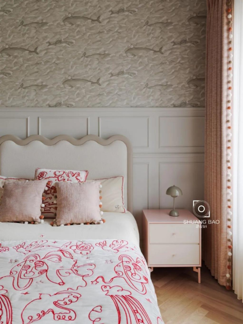 兒童房的細節充滿著愛與童趣,半墻壁紙上漫游的小魚仿佛在講述深海的秘密,波浪形床頭枕則描繪出海浪拍打岸邊的場景。