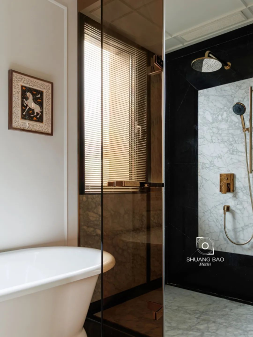茶色玻璃隔斷干濕兩區,由黑色大理石與中花白大理石組成的黑米色系淋浴間相對干區則更為冷冽,而通透的水紋玻璃門不僅隔斷臥衛空間,還引入自然光線,讓主臥的采光更通透明亮 。