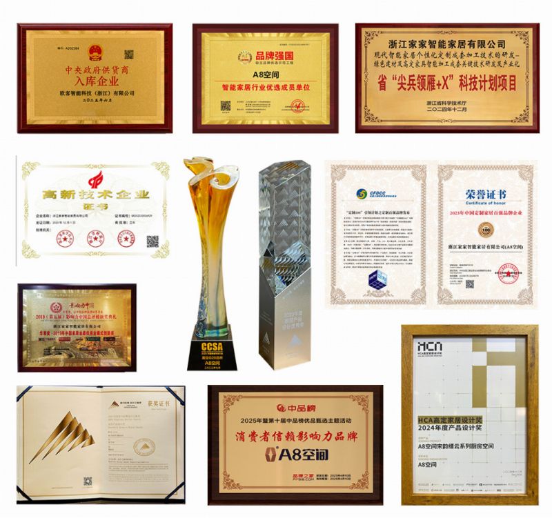 品質與信賴典范:A8 空間以硬核實力通過嚴苛的“浙江制造”及品字標認證,更成功躋身中央政府采購供貨商行列,具備服務國家級項目的專業資質;與此同時,品牌接連斬獲“品牌強國?自主示范工程”、“中品榜?消費者信賴十大品牌”等重磅榮譽,雙重認可深度印證了市場與消費者的廣泛信賴。