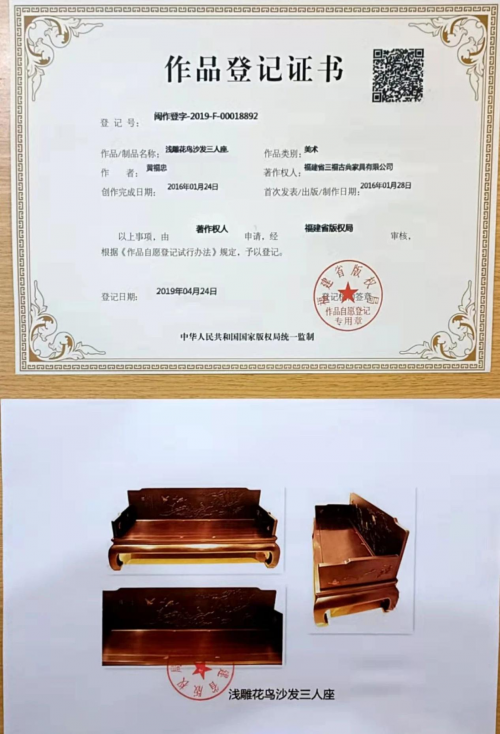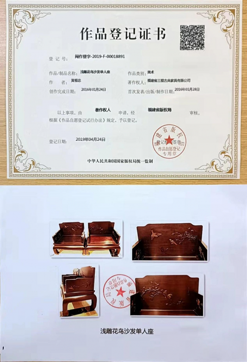 自2014年起,三福團隊便潛心投入該系列家具的研發。從最初的器型設計(2015年成功申請版權登記保護),到2016年對雕刻圖案進行二次研發設計并完成成品,直至2019年對最終的雕花鳥沙發組合成品本身進行版權登記,三福展現了對知識產權全鏈條保護的深刻理解,貫穿于設計、打樣、定稿、生產全過程的主動保護策略。
