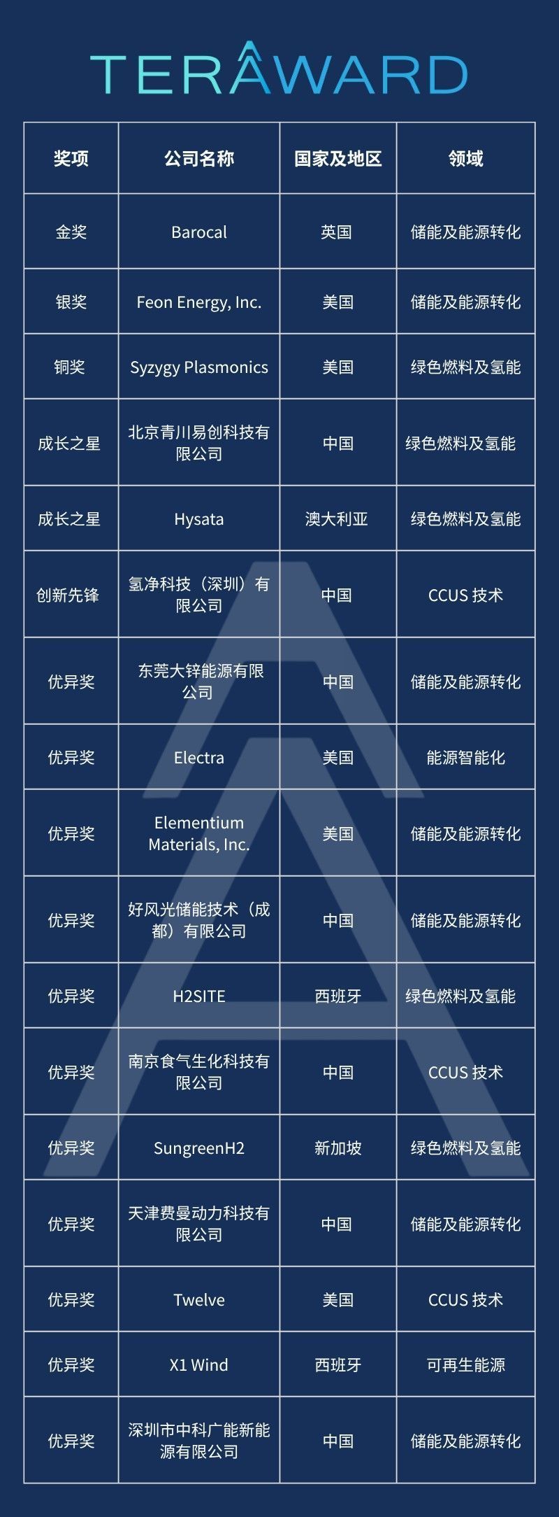 除金、銀、銅獎外,大賽還設置了多個獎項,其中“成長之星”由澳大利亞的Hysata及北京青川易創科技有限公司獲得;“創新先鋒”授予氫凈科技(深圳)有限公司。此外,來自中、美、西班牙、新加坡等國家的11家企業榮獲“優異獎”,涵蓋儲能及能源轉換、綠色燃料及氫能、CCUS技術、能源智能化、可再生能源等多個領域。