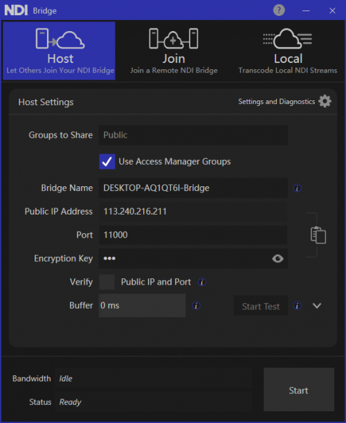 NDI Bridge的工作機制其實非常簡單。NDI Bridge Join模式從一端 (A) 的網絡中利用NDI發現機制找出所有(你想要橋接的)NDI源,把這些NDI源的名稱告訴另外一端 (B);在另外一端 (B),NDI Bridge Host模式將這些NDI源的名稱在(B)的網絡中創建一份“影子副本”,讓它們在(B)端的網絡中可被NDI發現,但請注意,此時并沒有正式傳輸視頻和音頻。當NDI解碼器連接到這些“影子副本”的NDI源時,兩個Bridge(Join和Host)開始握手協商了,視頻和音頻才開始正式從 (A) 傳輸到 (B)。