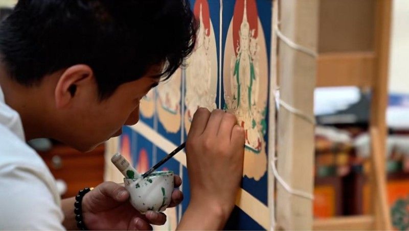 嘉絨唐卡之美,源于對極致工藝的堅守。唐卡的繪制要求十分嚴(yán)苛,嘉絨傳統(tǒng)唐卡在制作畫布時,采用一種特殊的泥土,當(dāng)?shù)厝朔Q之為“比曼”,和骨膠調(diào)制好以后均勻地涂抹在繃緊的畫布上。畫布晾干打磨好后即可開始構(gòu)圖起稿、炭筆淡墨勾勒、渲染、平涂、勾線、描金(鐵線描、高古游絲描、柳葉描、行云流水描等傳統(tǒng)手法)、開眼等一整套工藝流程。一幅唐卡,需要繪制幾個月甚至一年的時間,在時間與匠心的沉淀中,藝術(shù)成為了永恒。