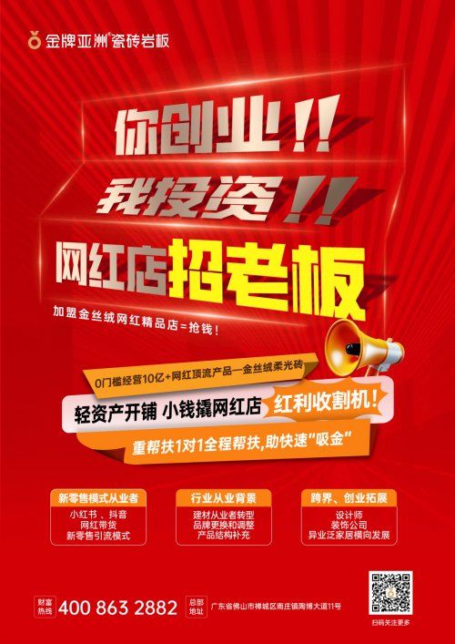 在建材家居行業新零售浪潮下,金牌亞洲憑借“網紅精品店盈利模式” 與“金絲絨爆品戰略”雙引擎,以強勢品牌勢能霸屏廣州南站觸達億萬高凈值人群;與此同時,品牌全國首推的金絲絨網紅精品店招商也熱力開啟,以 “你創業,我投資” 的誠意,為建材行業創業者鋪就低門檻、高回報的路徑。陶博會期間,金牌亞洲“選金牌?贏未來”財富招商會即將啟動,在新零售浪潮中為創業者打開家居行業的財富新大門。