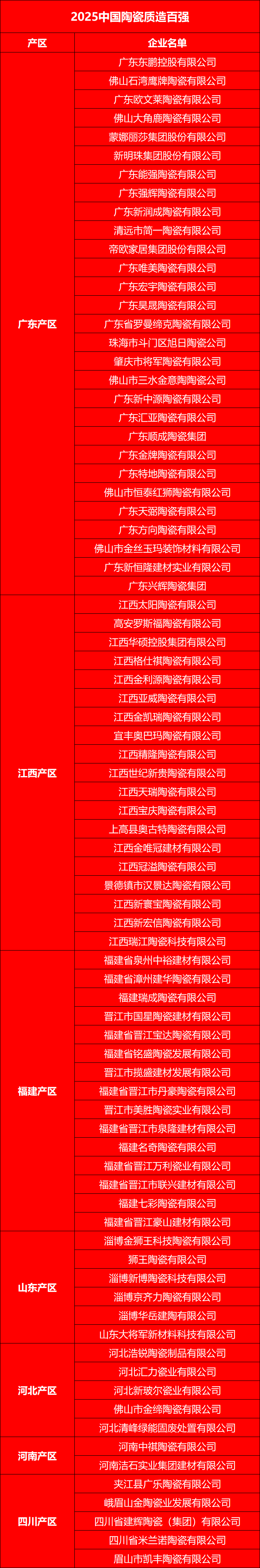 作為對中國陶瓷堅守品質企業的致敬,大會隆重發布、授牌了“2025中國陶瓷質造百強” 榜單并進行了授牌儀式,這些行業頭部企業、產區實力企業入選: