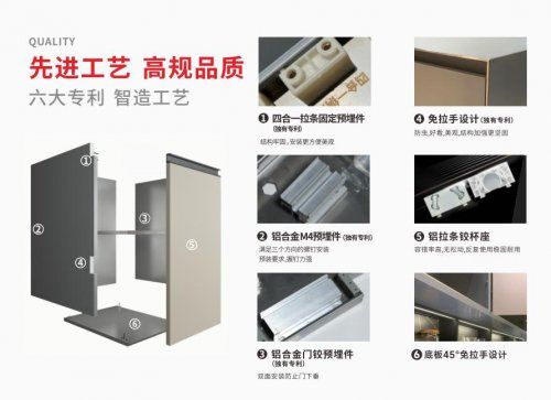 玖奈擁有六大專利技術,包括四合一拉條固定預埋件、鋁合金M4預埋件、鋁合金門鉸預埋件、免拉手設計、鋁拉條鉸杯座和底板45°免拉手設計。這些專利技術實現了結構牢固、安裝便捷、防門下垂、防蟲美觀等實用功能,為產品耐用性提供堅實保障。