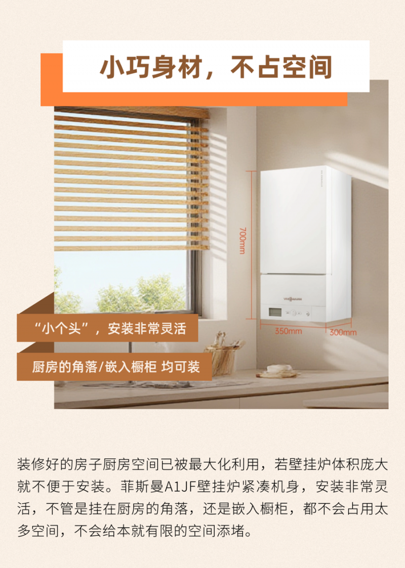 裝修好的房子廚房空間已被最大化利用,若壁掛爐體積龐大就不便于安裝。菲斯曼A1JF壁掛爐緊湊機身,安裝非常靈活,不管是掛在廚房的角落,還是嵌入櫥柜,都不會占用太多空間,不會給本就有限的空間添堵。
