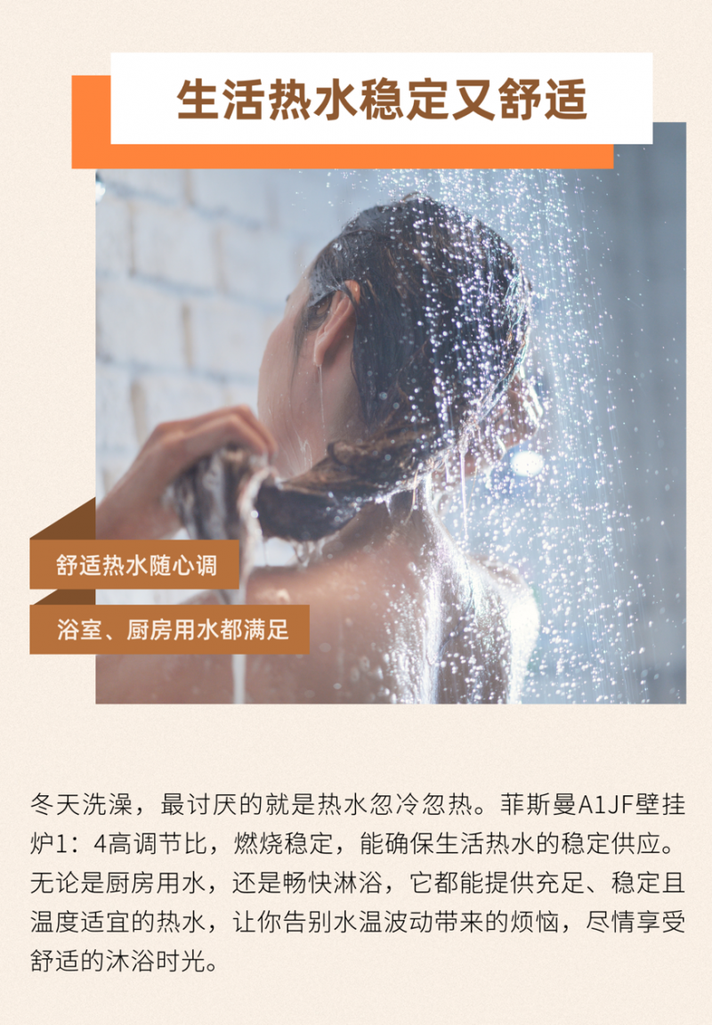 冬天洗澡,最討厭的就是熱水忽冷忽熱。菲斯曼A1JF壁掛爐1:4高調節比,燃燒穩定,能確保生活熱水的穩定供應。無論是廚房用水,還是暢快淋浴,它都能提供充足、穩定且溫度適宜的熱水,讓你告別水溫波動帶來的煩惱,盡情享受舒適的沐浴時光。