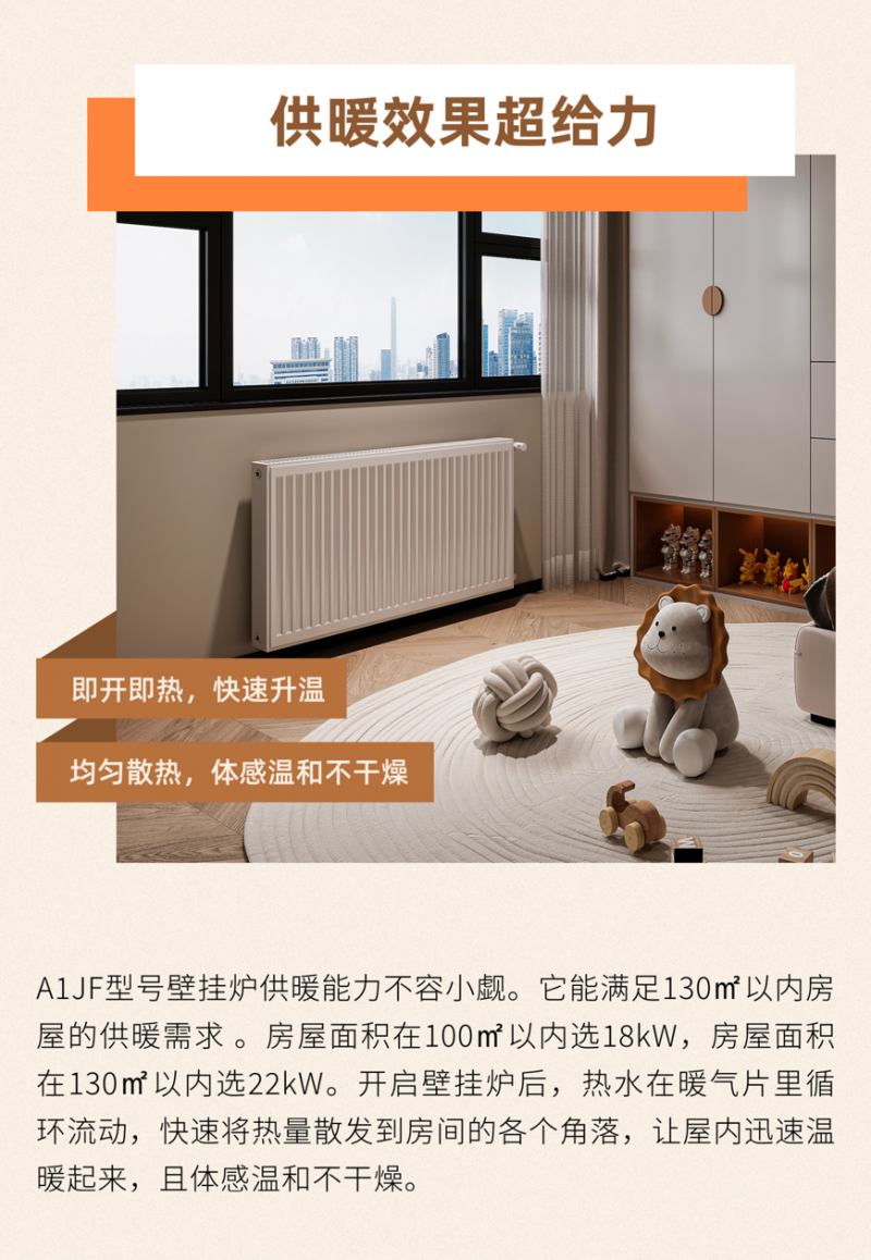 A1JF型號壁掛爐供暖能力不容小覷。它能滿足130㎡以內房屋的供暖需求。房屋面積在100㎡以內選18kW,房屋面積在130㎡以內選22kW。開啟壁掛爐后,熱水在暖氣片里循環流動,快速將熱量散發到房間的各個角落,讓屋內迅速溫暖起來,且體感溫和不干燥。