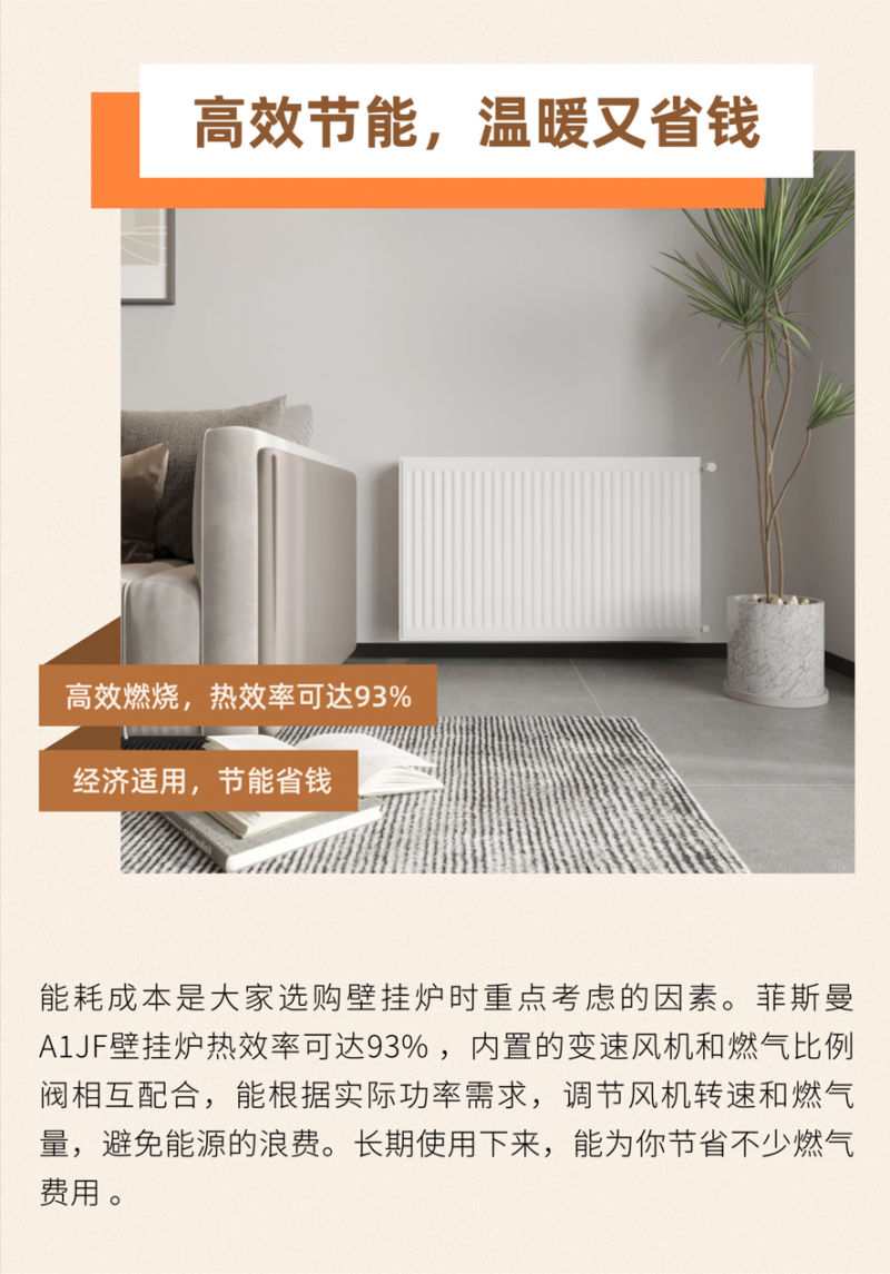 能耗成本是大家選購壁掛爐時重點考慮的因素。菲斯曼A1JF壁掛爐熱效率可達93%,內置的變速風機和燃氣比例閥相互配合,能根據實際功率需求,調節風機轉速和燃氣量,避免能源的浪費。長期使用下來,能為你節省不少燃氣費用 。